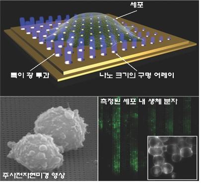 김동현 교수는 “금속 나노패턴의 특이 광투과 현상을 이용해 세포 안의 생체분자를 관찰하기 어려운 기존 광학현미경의 종축해상도 한계를 극복하고 해상도를 수십 나노미터까지 향상시켰다”고 밝혔다.