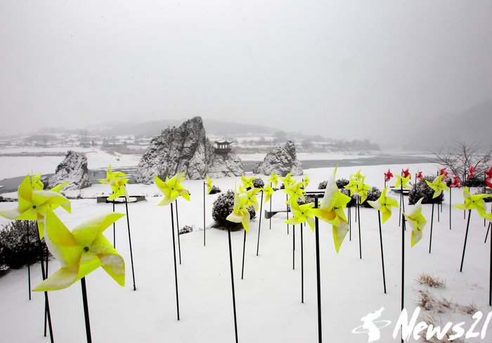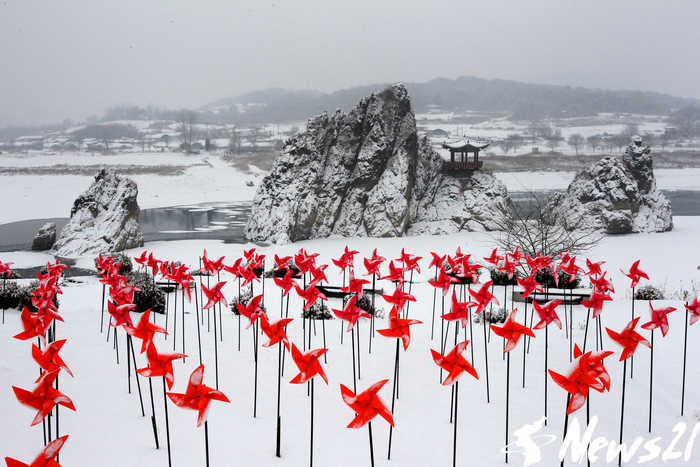 충북 단양군 도담삼봉이 지난 해 11월 군에서 설치한 바람개비로 어린이들의 동심을 자극하면서 겨울 가족 여행객들의 발길을 끌고 있다.