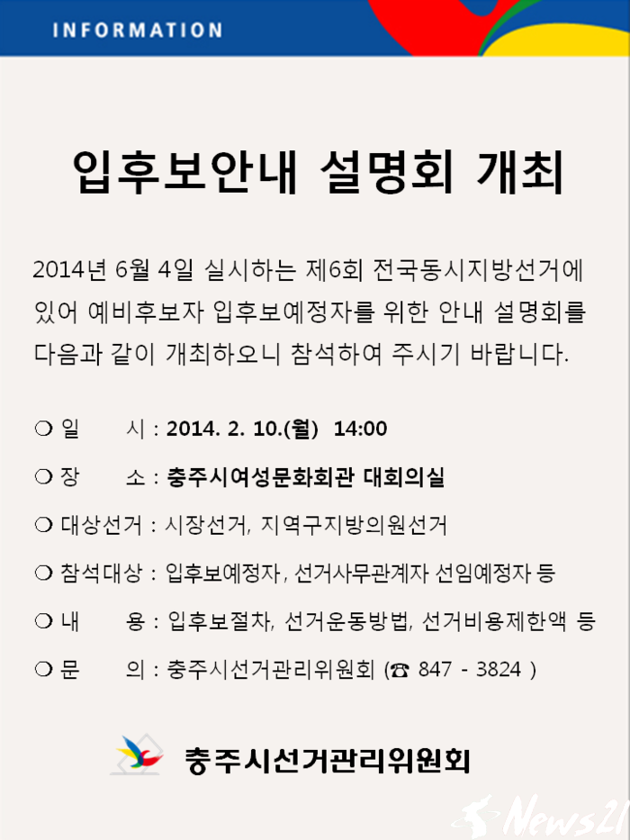 이번 충주시장선거, 지역구도의원 및 지역구시의원선거의 예비후보자등록신청은 2014. 2. 21.(금)부터 가능하며, 선관위는 예비후보자등록신청서류 준비 및 선거운동방법 등에 관한 유용한 정보를 제공할 이번 설명회에 입후보예정자 및 선거사무관계자들의 많은 참석을 당부했다.