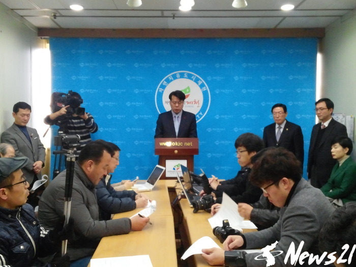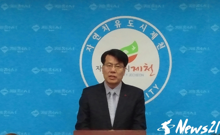 | ▲ 제천시청 브리핑룸에서 한국청소년운동연합총재 이근규 씨가 제천시장 후보 출마선언 하고있다 © 남기봉=기자 | |