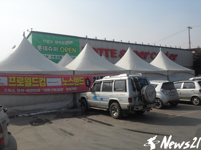| ▲ 제천시 청전동165번지 롯데슈퍼 주차장내 설치된 대형 천막이 8개동이 설치되어 아웃도어 할인 행사를 하고 있다. © 남기봉=기자 | |