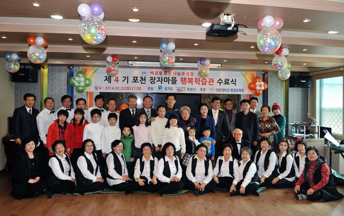 경기도는 지난 22일 경기행복학습마을 1호인 포천 장자마을에서 김문수 경기도지사, 최운실 국가평생진흥원장, 서장원 포천시장을 비롯해 마을주민 등 100여명이 참석한 가운데 제4회 포천 장자마을 행복학습관 수료식을 개최했다.