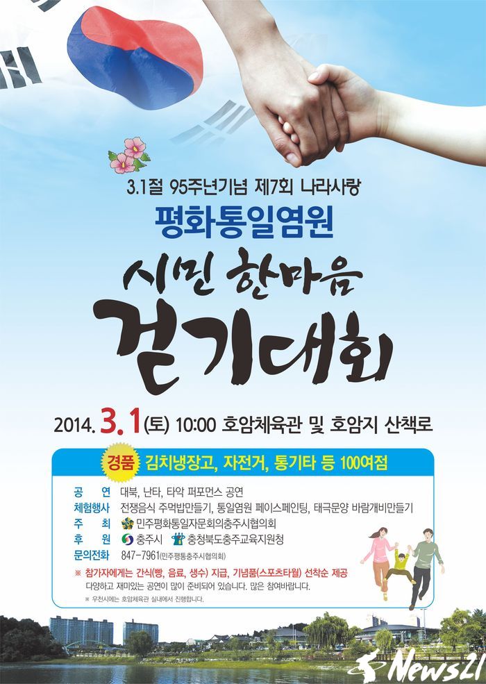 제7회 평화통일염원 시민한마음 걷기대회가 오는 3월 1일 충주시 호암체육관 및 호암지 일원에서 개최된다.