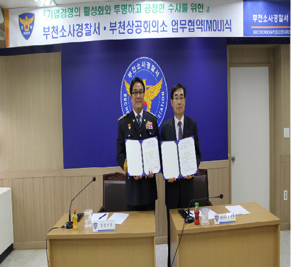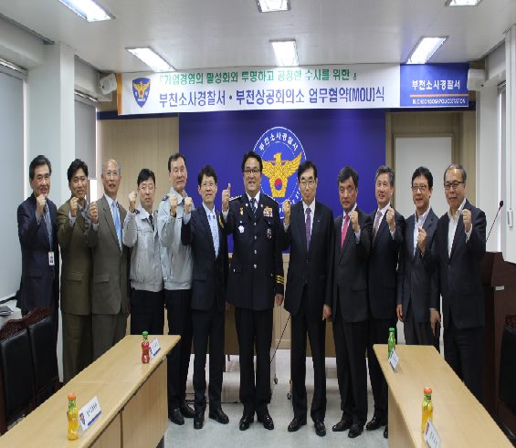 지난 4월 3일 부천상공회의소와 부천소사경찰서는 부천소사경찰서 3층 중회의실에서 『기업경영 활성화 및 공정한 수사를 위한 업무협약식』을 체결하고 부천관내 기업의 경영활성화와 공정한 수사를 위해 공동으로 노력해 나가기로 했다.