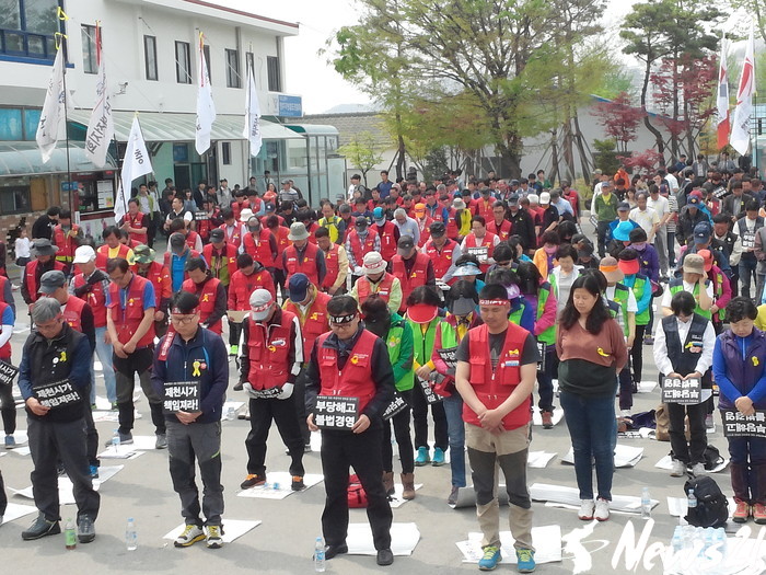 ▲  26일 오후2시 제천역에서 택시노동자와 민주노총 충북지역본부 조합원들이 집회에 앞서 진도 앞바다 세월호 참사로 인한 희생자 들에 대한 묵념을 하고 있다.   © 남기봉=기자