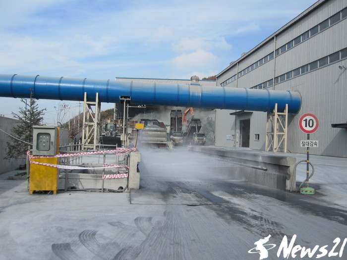 | ▲ 충북도 북부출장소와 합동으로 단양군 매포읍 상괴리 (주)네비엔 폐기물 업체 공장내 세륜시설을 점검하고 있다. © 남기봉=기자 | |