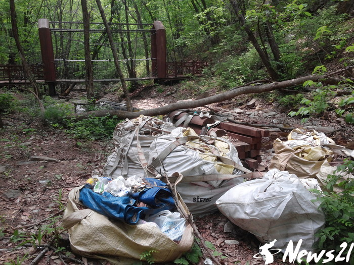 ▲ 충북 제천시 수산면 얼음골 등산로 다리 공사를 하고 남은 건축 자재를  1년이상 치우지 않아 전국각지에서 등산로를 찾은 등산객들이 눈쌀을 찌푸리고 있다.    © 남기봉=기자