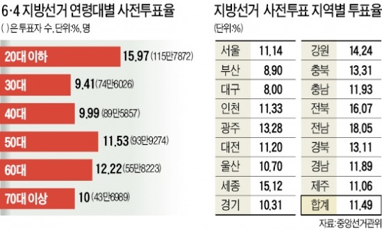 지난달 30~31일 처음 치른 6·4 지방선거 사전투표 결과 20대 이하와 60대의 투표 참여율이 팽팽한 것으로 나타났다.