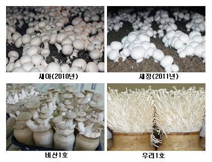 농촌진흥청에서 육성한 대표 품종은 양송이 ‘새아’, ‘새정’, 팽이 ‘우리1호’, 아위느타리 ‘비산1호’ 등이 있다.