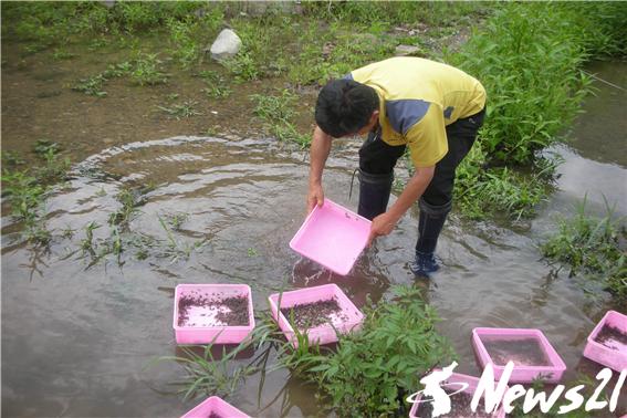 | ▲ 지난해 민물참게 치어를 방류하고 있는 모습 © 남기봉=기자 | |