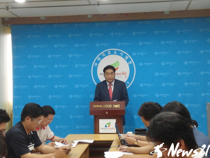 | ▲ 9일 제천시청 브리핑실에서 선거기간에 문제가 제시됐던 의림지 이벤트홀 대하여 기자회견을 열고 있다. © 남기봉=기자 | |