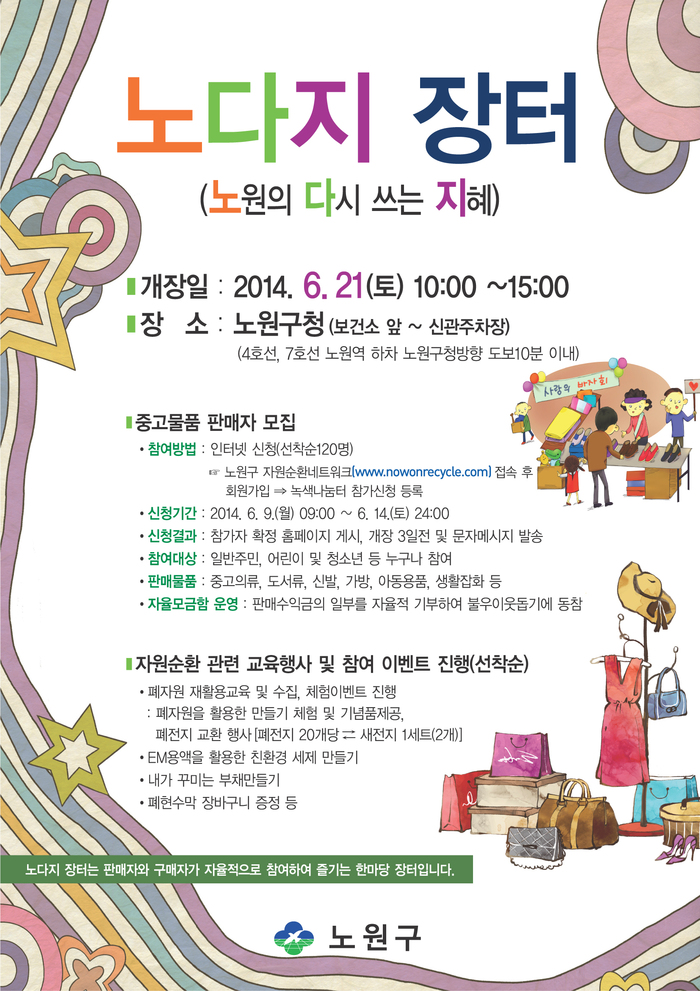 서울 노원구(구청장 김성환)는 유한한 자원을 재활용하는 문화를 확산키 위해 21일 오전 10시부터 오후 3시까지 노원구청 보건소 앞에서(신관주차장 까지) ‘노다지 장터’를 추진한다고 19일 밝혔다.