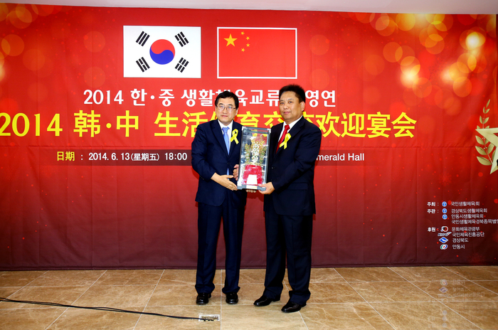 2914년한,중 친선생황체육교류전개최 경북을 새계로홍보 경상북도는 6월12일~17일까지6일간 안동시와 이근 의성군에서중국푸젠성 체육회 59명을 초청회 한, 중 생활체육 교류전을 개최하고있다