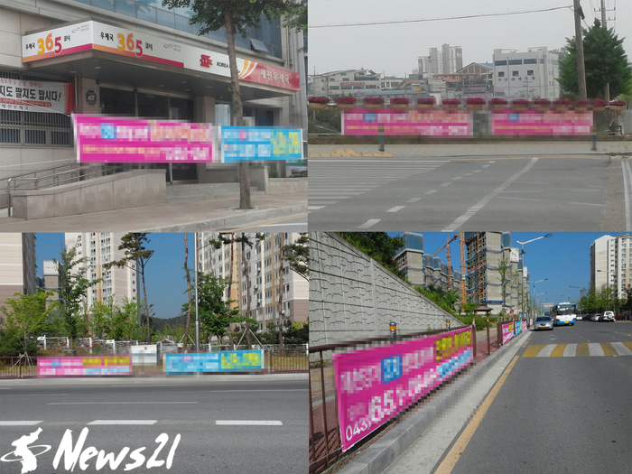 그러나 제천지역 아파트시행사들이 경쟁적으로 분양에 나서면서 시내 주요도로변은 물론 아파트벽면 단지울타리에 현수막이 무질서하게 부착되고 있다.