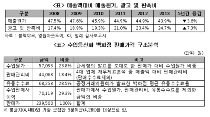 공정위에서 발표한 백화점 평균수수료율이 28.5%임을 감안하면 제조사는 유통수수료율이 가장 높은 백화점 판매를 기준으로 수수료를 반영, 제품가격을 책정하고 있는 것으로 판단된다.