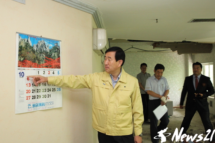 ▲ 22일 조길형 충주시장이 찾아가는 현장시장실로 수안보 구 와이키키호텔을 찾아 이랜드 리모델링 공사현장을 둘러보고 있다. 조 시장이 지난 2002년 10월 달력을 가르키며 과거의 영광을 되찾기 위한 조속한 사업 추진을 강조했다. © 남기봉=기자