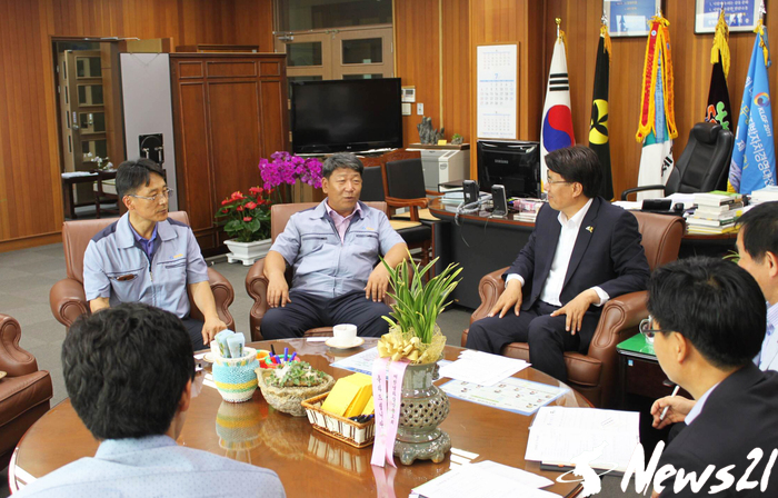 | ▲ 이근규 제천시장이 지난 7월21일 이들 두 업체의 대표와 관계자를 시장실로 초청해 제천지역 입주를 환영하고 애로사항을 듣고 환담하고 있다. © 남기봉=기자 | |