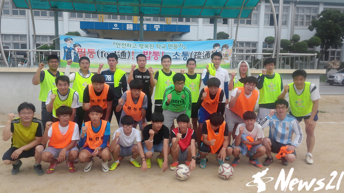 | ▲ 학교폭력 없는 즐거운 학교 만들기를 위해 제천경찰서의 특별 프로그램인 ‘필통(feel通), 밥통, 소통(疏通)의 날’ 행사의 일환으로 실시한 축구경기에 앞서 기념촬영을 하고 있다. © 남기봉=기자 | |