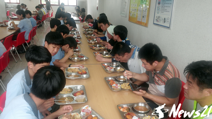 ▲ 운동후 경찰관과 학생들이 식당에서 함께 점심식사를 하며 담화를 나누는 시간을 가지고 있다.