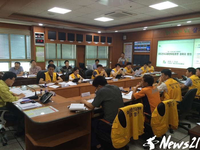 | ▲ 지난11일 유도선사고방생대응훈련 참여자 회의가 단양군 재난상활실에서 열렸다. © 남기봉=기자 | |