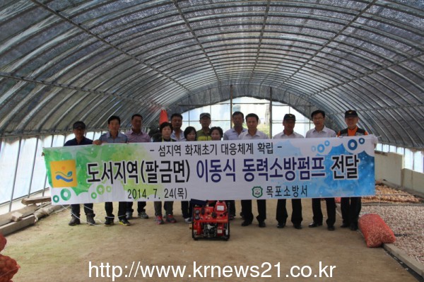 목포소방서(서장 차덕운)에서는 지난 24일 신안군 팔금면 당고리 마을에서 팔금면 남․녀 의용소방대원과 주민 등 50여명이 참석한 가운데, 섬 지역에서의 초기화재 진압체계 구축을 위한 이동식 동력소방펌프 전달식을 가졌다.