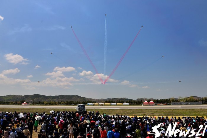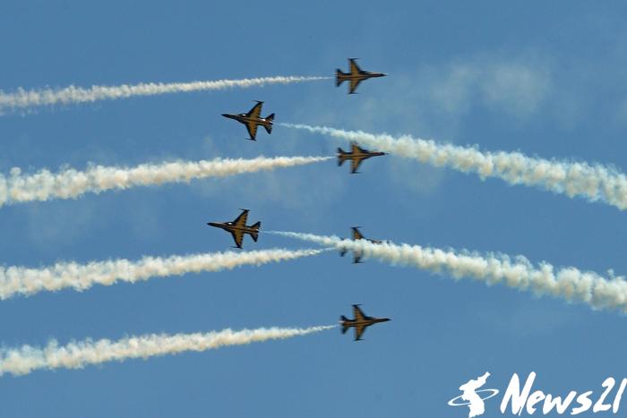 | ▲ 세계 최정상 대한민국 공군 특수비행팀 블랙이글의 에어쇼를 감상하고 있다. © 남기봉=기자 | |