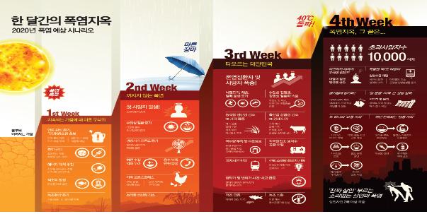때 이른 무더위와 마른 장마에 따른 폭염 피해가 우려되는 가운데, 오는 2020년 께 실현될 수 있는 미래 폭염 시나리오가 공개됐다. 30일 넘게 폭염이 지속되며 1만여 명에 달하는 사망자가 발생하고 기차 탈선 등 교통대란이 벌어지는 가히 무시무시한 예측결과이다.