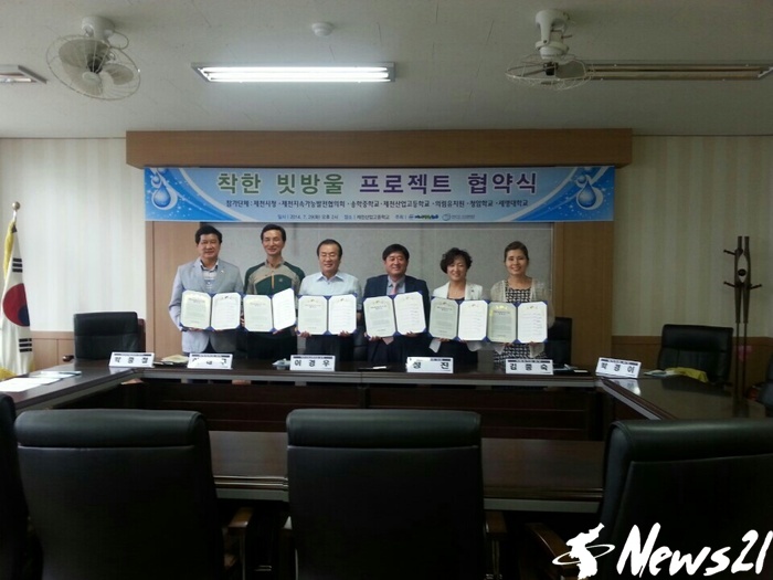 충북 제천지속가능발전협의회( 상임회장 박종철)는 기후변화대응을 위하여 빗물을 수자원으로 이용하는 ‘미래지속형 자원순환도시 만들기 2014 착한빗방울 프로젝트’의 일환으로 7월 29일 관내 4개 교육기관에 빗물저금통을 무료 보급하고 업무협약식을 체결했다.