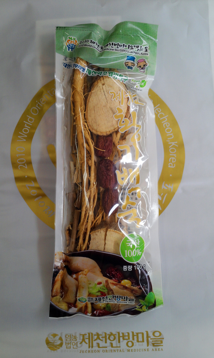 이 백숙용 한약재 세트는 제천한방마을영농조합법인에서 황기, 엄나무, 오가목, 대추, 하수오 등 품질 좋은 국산 한약재를 엄선 직접 제작해 백숙용 중닭 1마리 분으로 소포장 되어 있다.