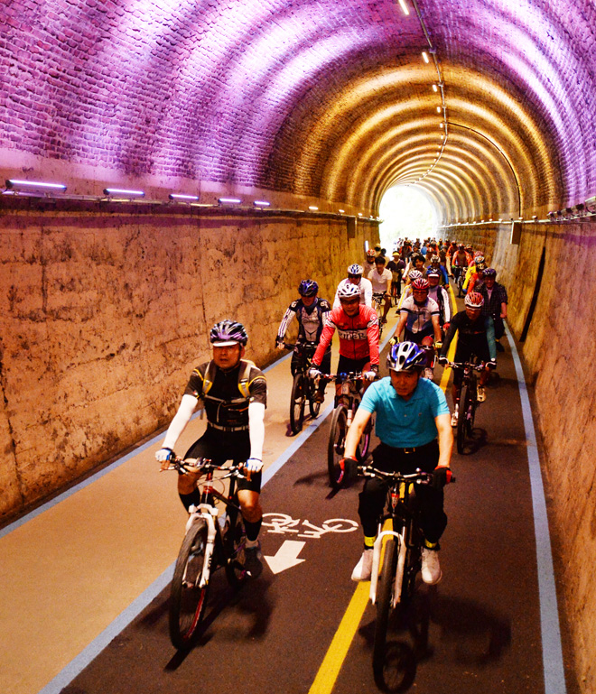 | ▲ 진주시 경상대학교 후문에서 옛 진주역을 잇는 자전거도로 개통식이 열린 15일 오후 이창희 진주시장, 진주시의회 의원, 자전거동호회 회원들과 시민들이 새롭게 단장된 진치령 터널을 지나고 있다. © 장경호 |