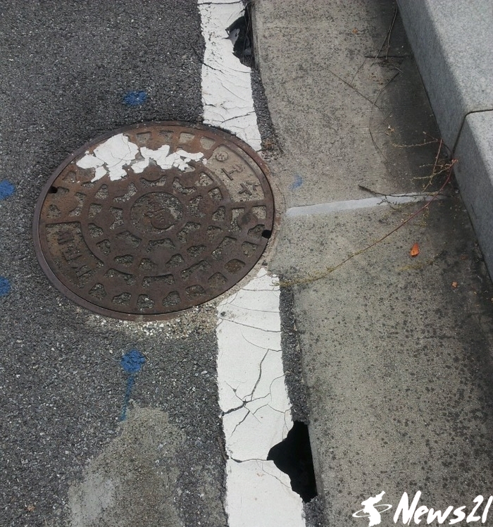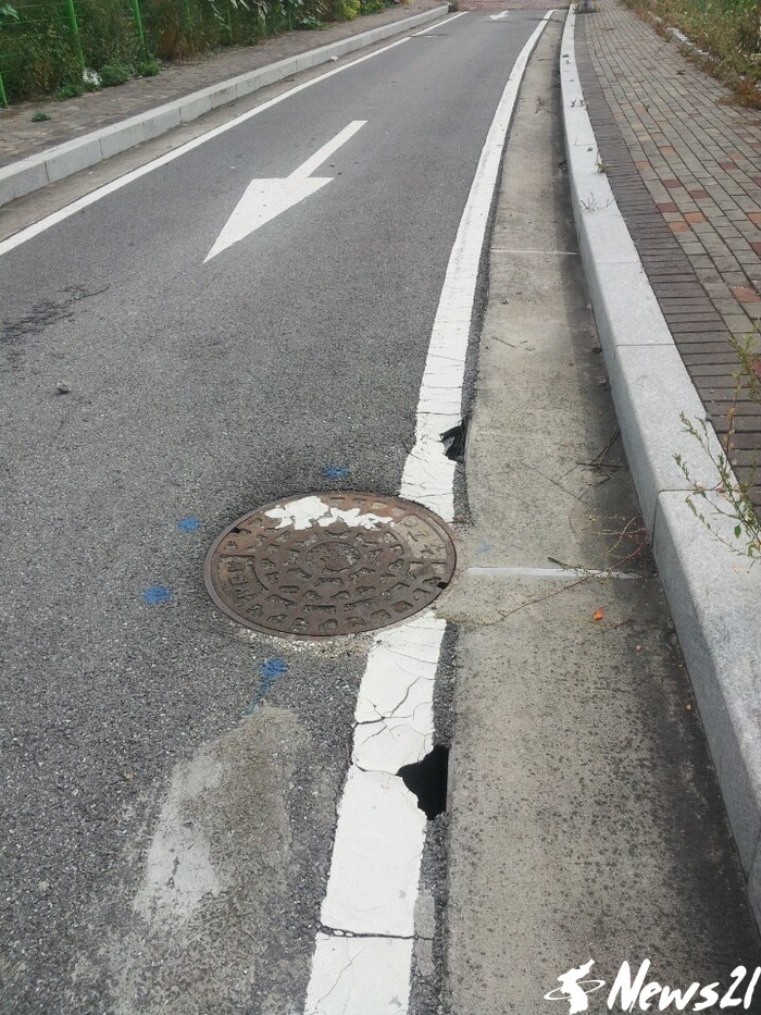 뉴스21의 확인 결과 오수 맨홀 인근에 20~30cm 파손된 아스팔트로 안에는 깊이 1.5~2m의 공간이 생겨 현재는 도로가 지표면에서 공중에 떠 있는 상황이다.