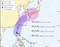 태풍의 간접 영향으로 23일 제주도에서 비가 시작되겠고 24일에는 전국 대부분 지방으로 비가 확대될 전망이다. 특히, 태풍의 경로에 가까운 제주도와 동풍의 영향으로 지형 효과가 더해지는 동해안을 중심으로 많은 비가 내릴 가능성이 있어 축대붕괴, 산사태와 저지대 침수 등에 대해 철처히 대비해야 한다.