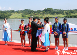 조길형 충주시장이 대회 6일차인 25일 충주 탄금호국제조정경기장에서 열린 2014 인천 아시안게임 조정 여자 경량더블스컬(LW2X) 결승전 우승자에 대한 시상을 했다. 이날 금메달은 중국, 은메달은 일본, 동메달은 태국이 차지했다