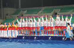 평택시청 직장운동경기부 하키 팀 소속 감독 한진수, 선수 김옥주, 오선순, 박기주, 이영실, 천은비 선수들이 인천아시안게임에서 금메달을 목에 걸었다.