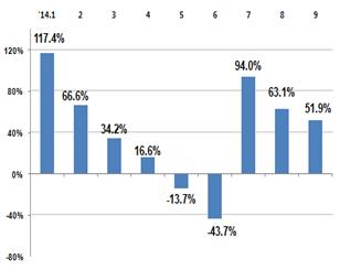 국토교통부는 ‘14. 9월 주택매매거래량은 8.6만 건으로 전년동월대비 51.9% 증가했으며, 9월 누계기준(71.0만건)으로도 전년동기 대비 21.6% 증가했다고 밝혔다.