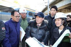 지난 13일, 박홍섭 마포구청장이 연남동에서 동교동으로 이어지는 경의선숲길 공원 공사현장을 찾아 관계자에게 진행상황을 보고받고 있다.
