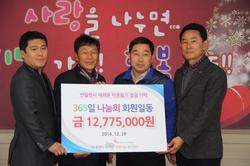 광양 365일 나눔회(회장 송명종)에서는 지난 2014년 12월 26일(금) 14:00 광양시사랑나눔복지재단 회의실에서 연말연시를 맞아 회원들이 정성껏 모은 성금 12,775,000원을 (재)광양시사랑나눔복지재단(이사장 문승표)에 전달했다.