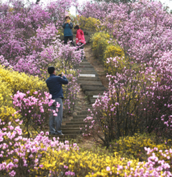 수도권 최대 규모의 진달래 군락지인 원미산 진달래동산에 7일 오후 나들이 나온 시민들이 진달래와 개나리 사진을 찍으며 즐거워하고 있다.