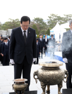4.19 민주묘지 참배행사에는 박형준 국회사무총장, 이은철 도서관장, 김준기 예산정책처장, 임성호 입법조사처장, 구기성 입법차장, 김대현 사무차장, 김성동 의장비서실장, 이수원 정무수석, 김성 정책수석 등이 함께했다.
