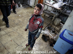 시리아 수도 다마스쿠스에서 반군과 정부군의 충돌로 부상을 당한 아이가 치료를 기다리고 있다.