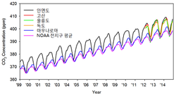우리나라의 경우는 기상청(청장 고윤화) 안면도 기후변화감시소에서 관측을 시작(1999년)한 이래, 2012년 1월에 처음으로 이산화탄소 월평균 값이 400 ppm을 넘어섰으며, 2012년 연평균 값은 400.2 ppm, 2014년은 404.8 ppm으로 관측되었다고 밝혔다.