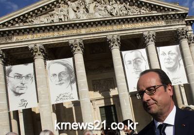 프랑스의 프랑수아 올랑드 대통령이 팡테옹에서 열린 행사를 마치고 자리를 떠나고 있다.