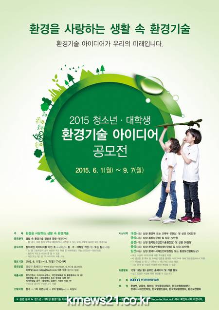 한국환경산업기술원(원장 김용주)은 전국 초·중·고·대학생을 대상으로 ‘2015년 청소년․대학생 환경기술 아이디어 공모전’을 개최하고 6월 1일부터 접수를 시작한다.