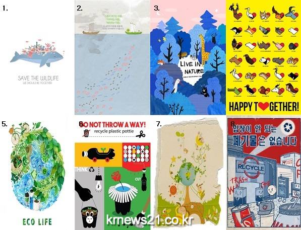 ▲ 1.SAVE THE WILDLIFE (작가ID:파이) 2.공생의 조건(작가ID:유신유) 3.Live in nature (작가ID:이한아) 4.해피 투게더 (작가ID:자이호) 5.에코라이프 (작가ID:제이) 6.Recycle plastic pottie (작가ID:윤토리) 7.꿈이 꽃피는 지구 (작가ID:원더) 8.재활용 클럽 (작가ID:이단)환경부는 네이버와 함께 제20회 ‘환경의 날’을 기념하는 ‘온라인 일러스트(그라폴리오) 공모전’을 개최하고 20개의 우수 작품을 선정했다. 이번 공모전은 “생물자원 보호, 미래를 위한 배려입니다”라는 ‘환경의 날’ 주제에 맞춰 ‘생물자원의 소중함’과 주요 국정홍보과제 중 하나인 ‘자원순환사회 실현’을 주제로 네이버 그라폴리오 사이트(www.grafolio.com)에서 4월 27일부터 5월 17일까지 열렸다.