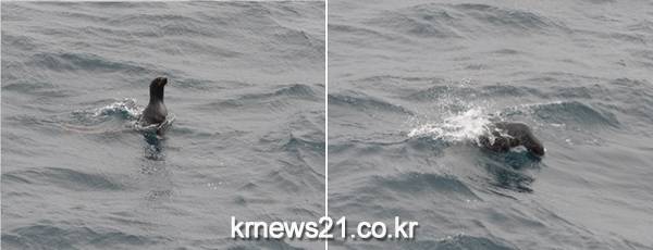 ▲ 물개 유영 모습해양수산부 국립수산과학원은 지난 5월 28일부터 6월 3일까지 실시한 독도 및 심해 생태계 수산자원 조사 중 독도 인근 해역에서 물개(Northern Fur Seal, Callorhinus ursinus) 2마리를 발견했다고 밝혔다.