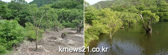 ▲ 이식된 모습(왼쪽), 이식 후 신엽 발생 모습(오른쪽)주왕산국립공원사무소는 2014년 주산지 생태경관 복원차원에서 이식한 왕버들(20년생 이상) 4그루 모두 새잎이 정상적으로 발생함으로써 생장상태가 양호하다고 밝혔다.