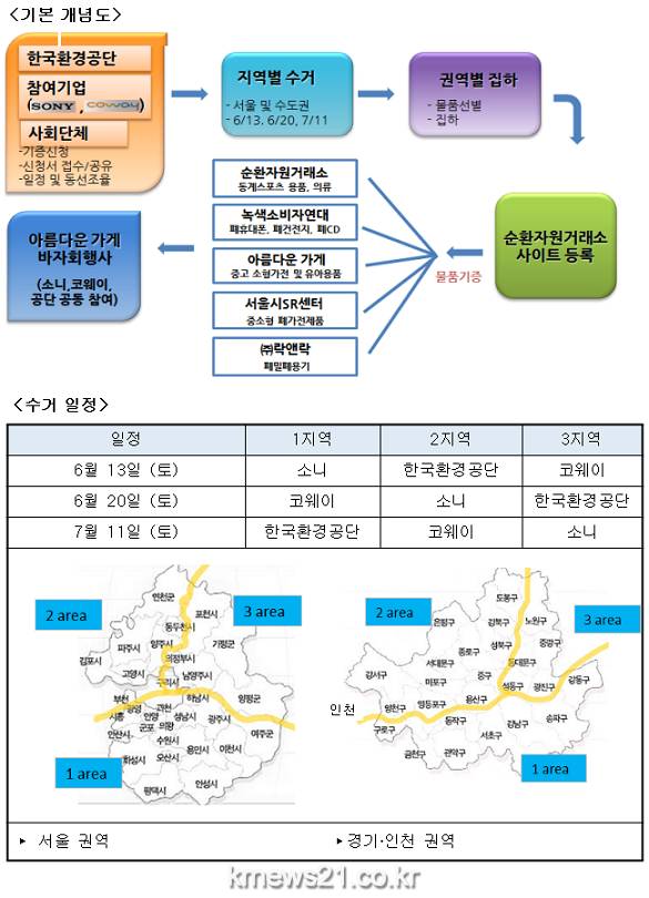 ‘순환자원 기증 캠페인’은 수도권(서울, 경기, 인천)을 대상으로 6월 13일, 6월 20일, 7월 11일, 총 3회에 걸쳐 수거를 진행하며 수거 품목은 소형 중고 전기·전자제품, 폐가전(대형가전 제외), 밀폐용기, 판매 가능한 유아용품, 책, 의류 등이다.