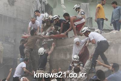 시리아 북부 알레포에서 정부군의 폭탄 공격으로 붕괴된 건물에서 시민들이 구조되고 있다.