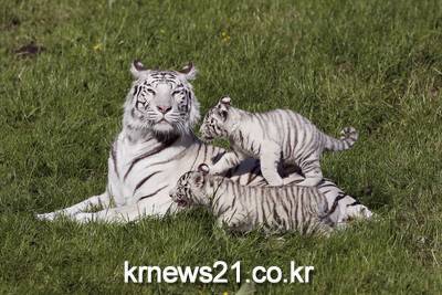 ▲ 프랑스 동물원의 어미 호랑이와 태어난지 두 달된 호랑이 ⓒAFP프랑스 북부 에르미발 레보의 세르자 동물원에서 어미 호랑이 리사와 태어난지 두 달된 아기 호랑이 2마리가 광합성을 즐기고 있다.