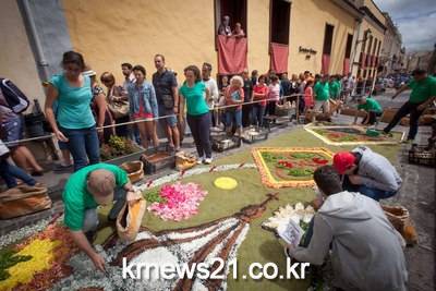 ▲ 스페인에서 성체축일을 맞이헤 거리를 꾸미고 있다. ⓒAFP스페인 카나리아 제도의 테네리페 섬에서 가톨릭 성체축일을 맞이해 거리에 꽃을 이용한 카펫을 만들고 있다.